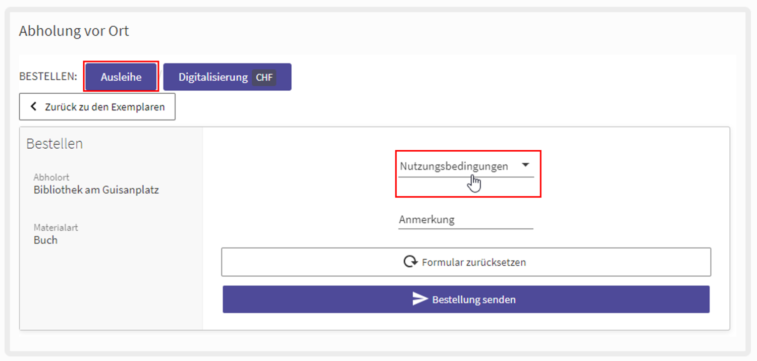 Um eine Anfrage zu stellen, klicken Sie auf „Ausleihe“ und wählen Sie im Dropdown-Menü „Abholort“ die Bibliothek aus, in die die Ressource geliefert werden soll. Die lokalen Kurierdienste sind kostenlos.