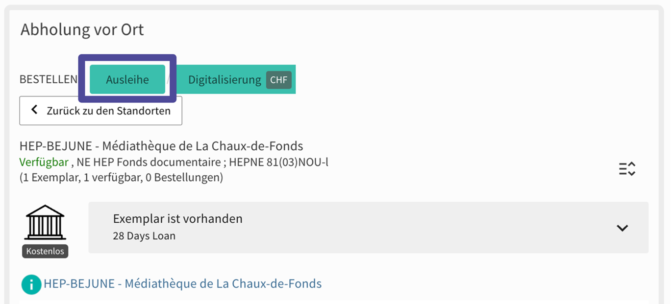 Wenn Sie in diesem Bereich mit der Schaltfläche «Ausleihe» ein Dokument vormerken, wird die Bibliothek, in deren Bestand das Dokument ist, es für Sie reservieren und Sie benachrichtigen, wenn es an der Leihstelle zur Abholung bereit ist.
