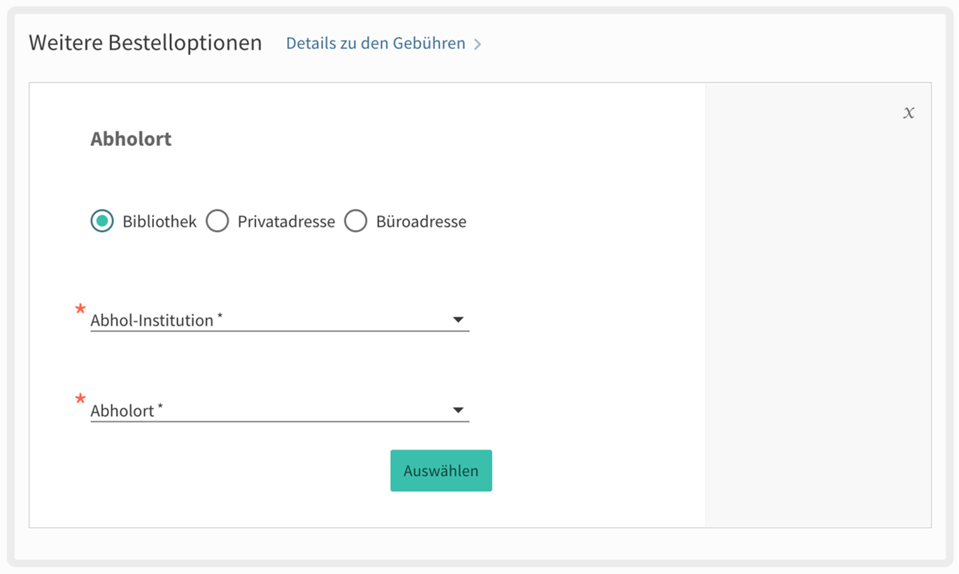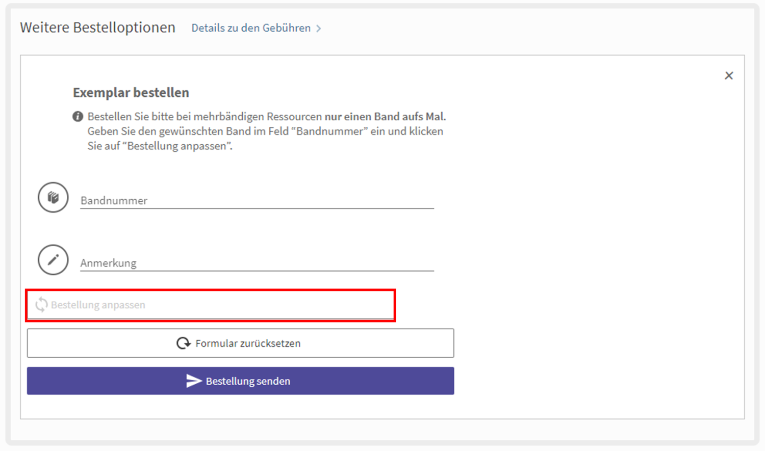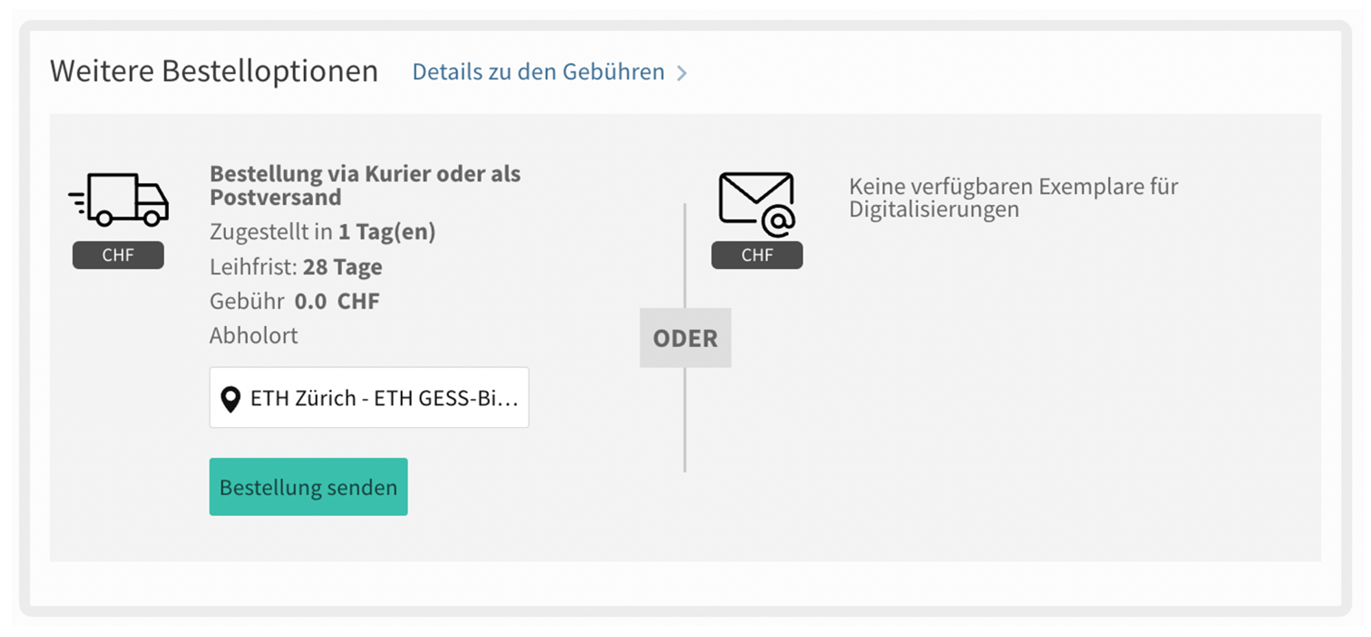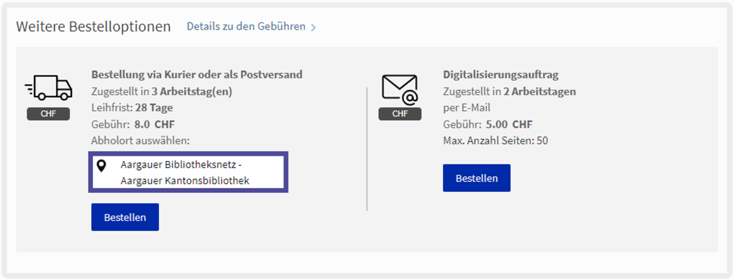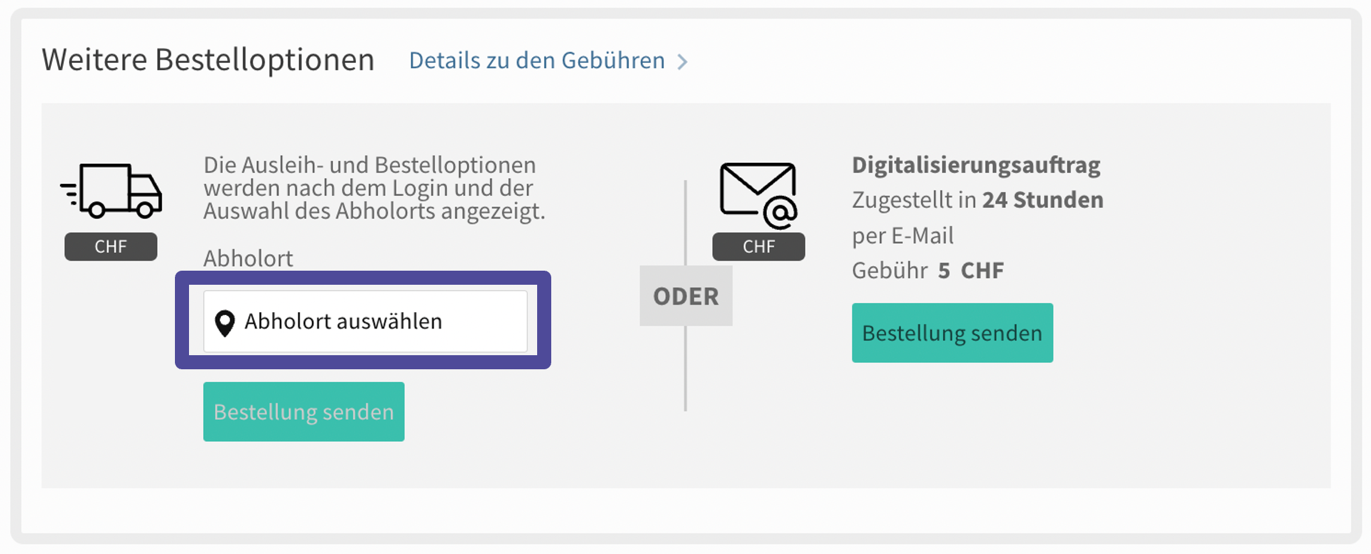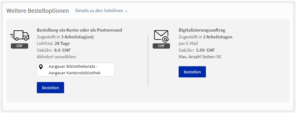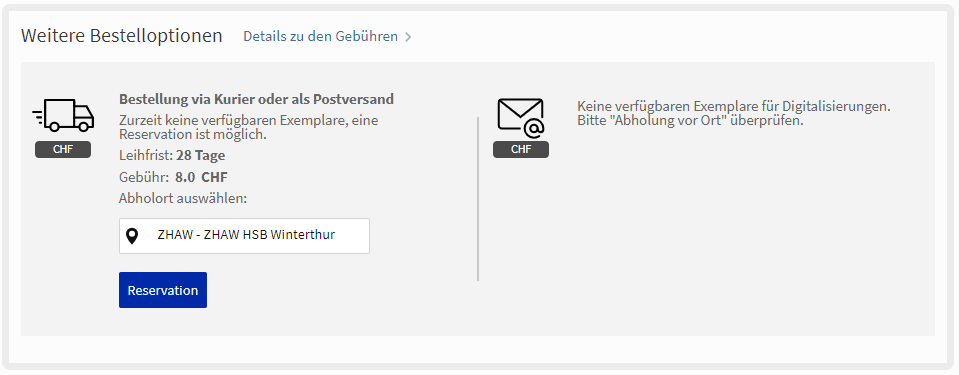 Wenn Sie mehrbändige Werke oder Ausgaben von Zeitschriften an eine andere Bibliothek liefern lassen möchten, müssen Sie diese über den Bereich «Weitere Bestelloptionen» vormerken. Hier können Gebühren anfallen. Diese werden beim Einreichen der Vormerkung angezeigt:
