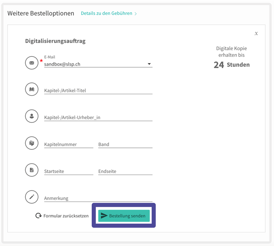Füllen Sie das Formular aus mit den Angaben zum Kapitel oder zum Artikel, das bzw. den Sie brauchen, und klicken Sie auf «Bestellung senden»:
