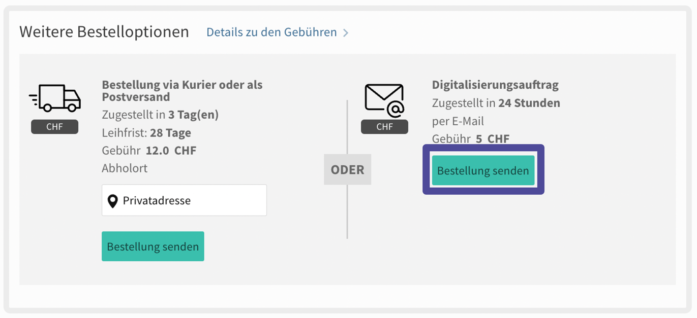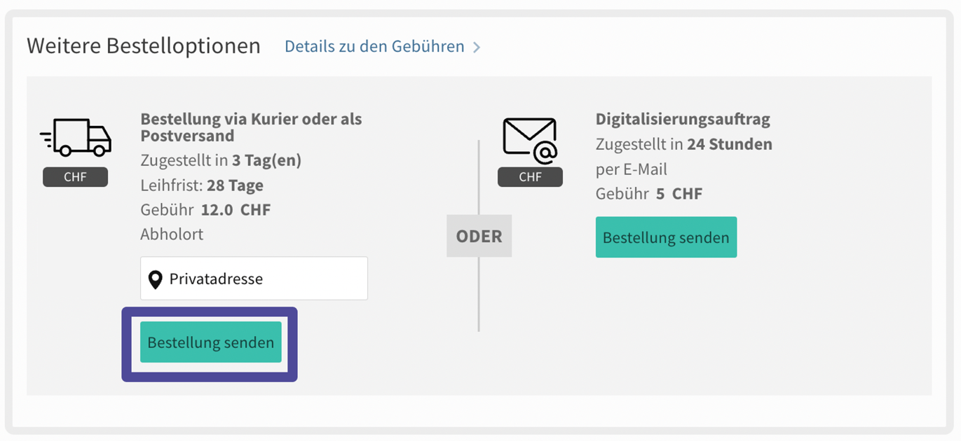 Wenn Ihre Institution am nationalen SLSP-Kurier teilnimmt, werden die Angebote für diesen Service unter «Weitere Bestelloptionen» angezeigt.