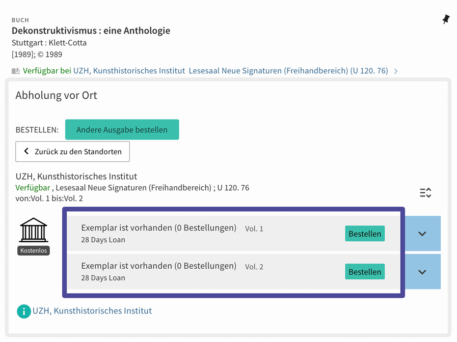 Mehrbändige Werke und Ausgaben von Zeitschriften können Sie kostenlos im Bereich «Abholung vor Ort» vormerken, wenn Sie diese direkt in der Bibliothek abholen wollen, in der sie sich befinden.