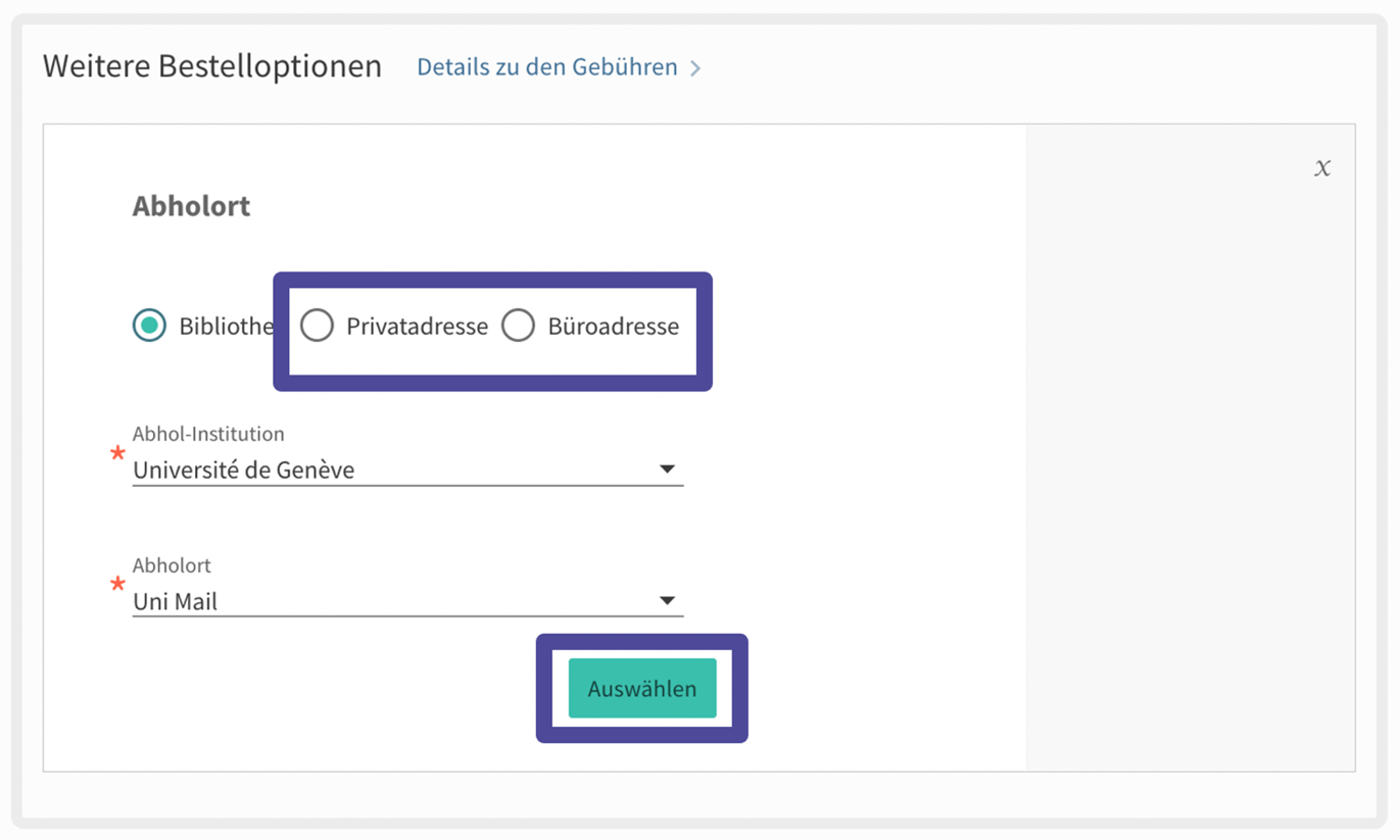 Der lokale Kurierdienst der folgenden Institutionen ist ebenfalls in diesem Bereich verfügbar: Universität und PH Bern, ETH Zürich, Universität Neuenburg, Universität Genf und HES-SO. Bestellungen über einen lokalen Kurier sind kostenlos.