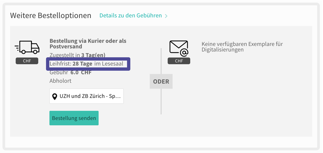 Einige physische Dokumente können aufgrund ihrer Wichtigkeit oder Seltenheit nicht mit nach Hause genommen werden. Sie können jedoch im Bereich «Abholung vor Ort» kostenlos vorgemerkt und im Lesesaal der Bibliothek, in der sie sich befinden, eingesehen werden. Zudem können sie zur Lieferung an eine andere Bibliothek bestellt werden, wo sie ebenfalls vor Ort eingesehen werden können. In diesem Fall können Gebühren anfallen. Der Abschnitt «Weitere Bestelloptionen» zeigt bei solchen Exemplaren den Hinweis «im Lesesaal» an: