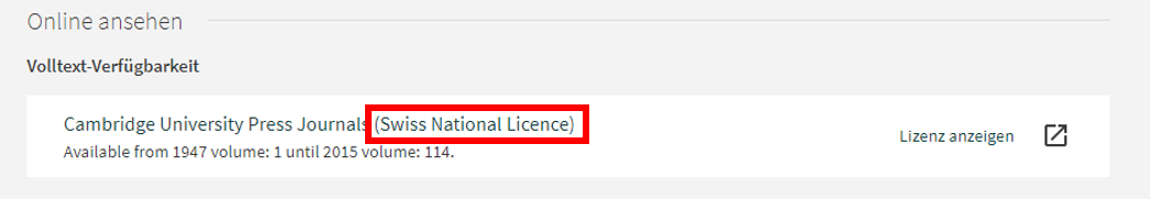 Verfügbare Ressourcen aus nationalen Lizenzen sind im Bereich «Volltext-Verfügbarkeit» als Swiss National Licence in Klammern gekennzeichnet.