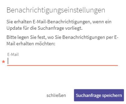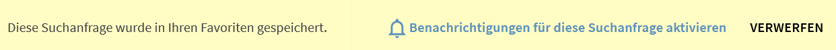 Wenn Sie Ihre Suchanfrage speichern, können Sie eine E-Mail-Benachrichtigung abonnieren. In diesem Fall erhalten Sie eine E-Mail, wenn es Neuigkeiten zu Ihrer Anfrage gibt. Zur Aktivierung dieses Service erscheint oben auf der Seite automatisch eine Meldung.