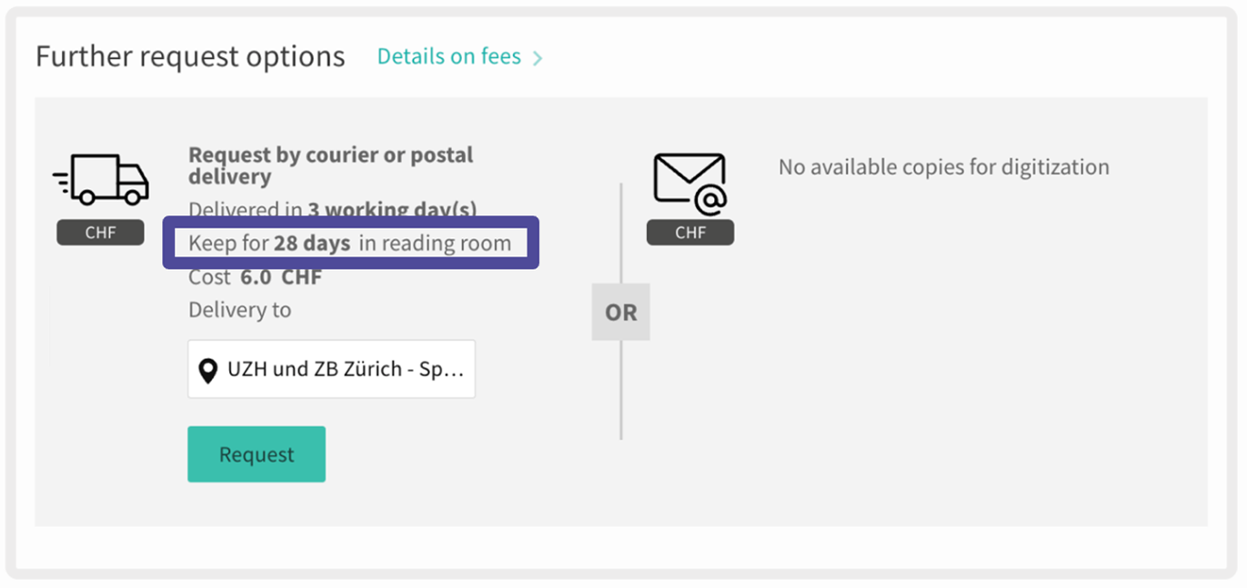 Some physical documents cannot be taken home because of their importance or rarity. It is however possible to consult them in a reading room. These items can also be requested for delivery to another library, where they must be consulted on site. In this case, the “Further Request Options” section will display the indication “in reading room”: