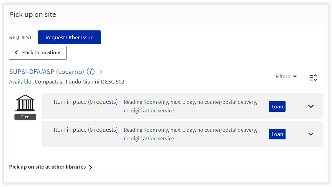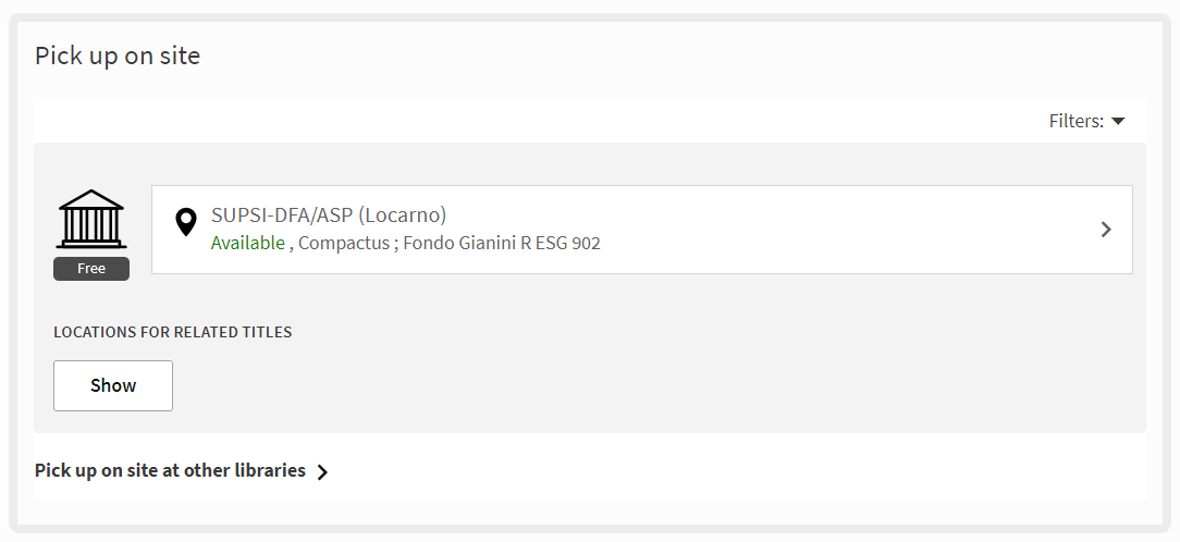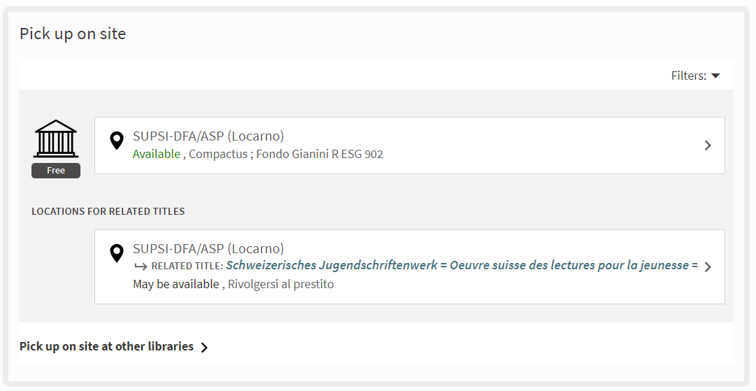 The «Pick up on site at other libraries» section works the same as the «Pick up on site» section and display the availabilities from other libraries members of swisscovery.