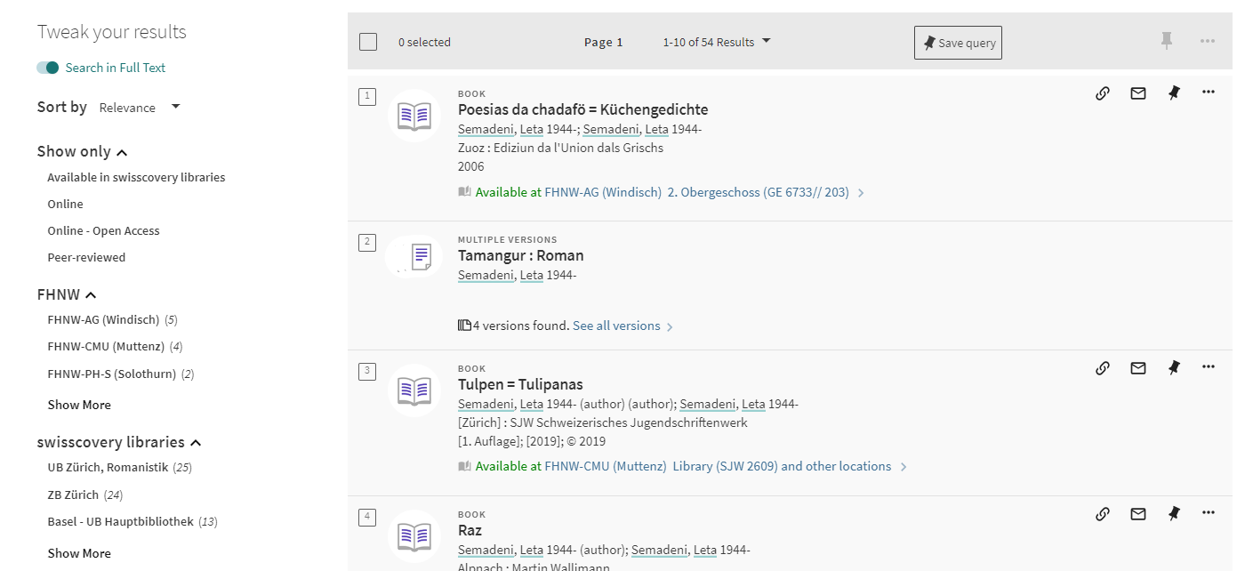The search results page contains a brief description of the resources, the calculation of their availability and, in the left column, a series of useful tools to refine the list of results.