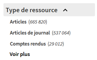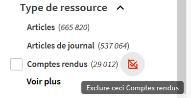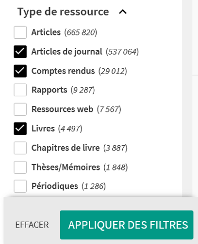 Exemple: Réduisez la recherche à «Articles de journal», «Comptes rendus» et «Livres».