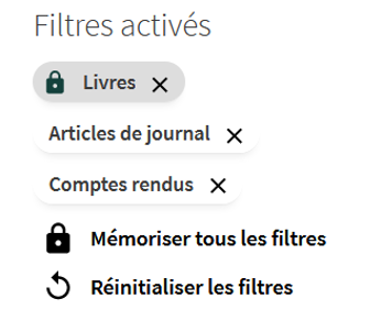 La saisie d'une nouvelle recherche supprime automatiquement tous les filtres. Toutefois, vous pouvez conserver un filtre pendant toute la durée de la session de navigation en le sélectionnant puis en cliquant sur le symbole cadenas. Pour supprimer ce filtre, cliquez à nouveau sur le cadenas.