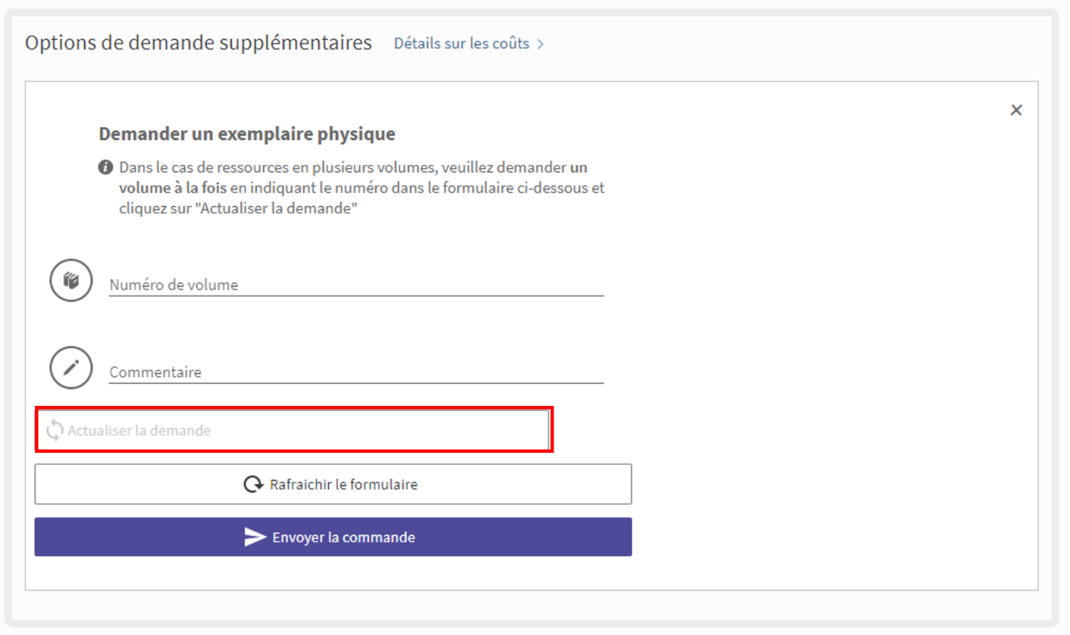 Lors de la demande d’un ouvrage en plusieurs volumes dans la section « Options de demande supplémentaires », veuillez toujours indiquer quel volume et/ou numéro vous souhaitez demander dans le formulaire de demande et cliquez sur “actualiser la demande” avant d’envoyer la demande :