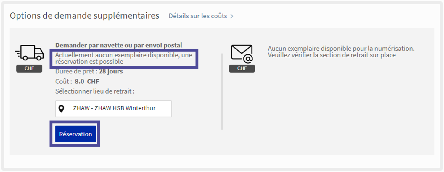 Si un document n’est pas disponible pour la navette ou l’envoi postal parce qu’il est déjà en prêt, il est possible de faire une demande de réservation. Vous recevrez une notification dès que le document sera rendu à la bibliothèque par d’autres lecteur·x·trice·s.