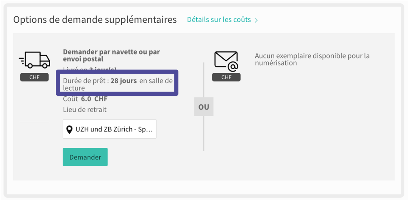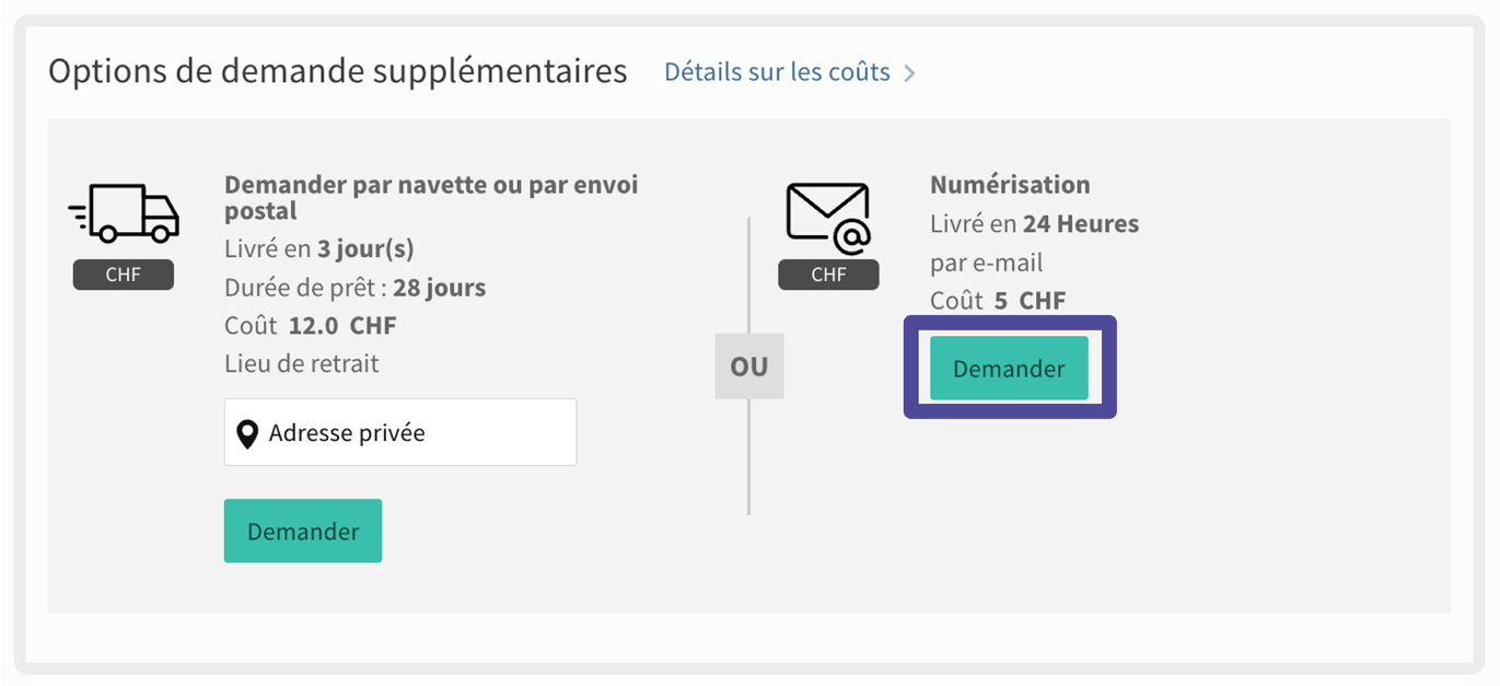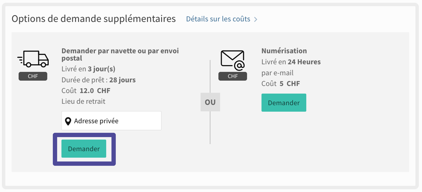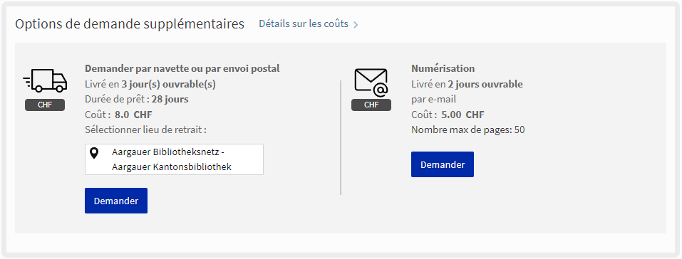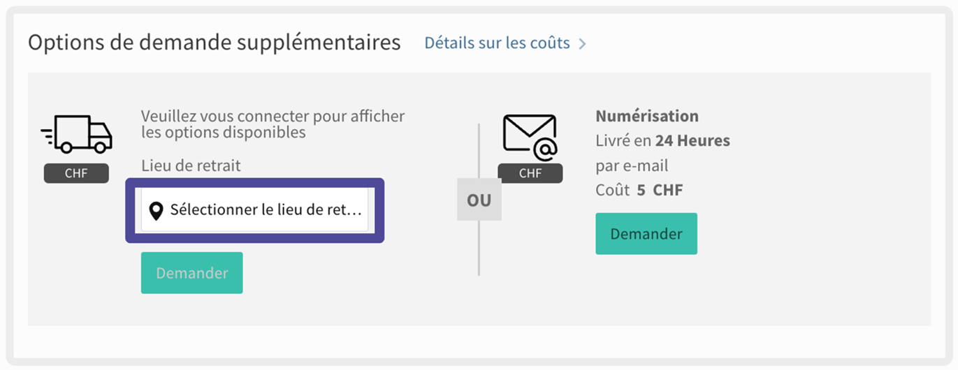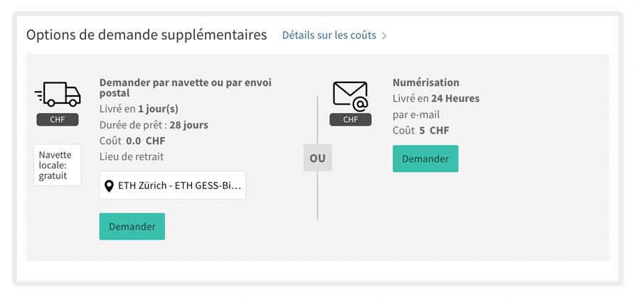 Dans cette section, il est possible de demander des ressources via le service de courrier national SLSP pour certaines bibliothèques swisscovery et Renouvaud et le service de courrier local des institutions suivantes : Universität und PH Bern, ETH Zürich, Université de Neuchâtel, Université de Genève et HES-SO. Il est également possible de demander une numérisation ou des livraisons postales.