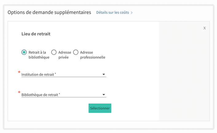 Pour demander la livraison d’un document, modifiez le lieu de retrait si nécessaire, puis cliquez sur le bouton « Demander ».