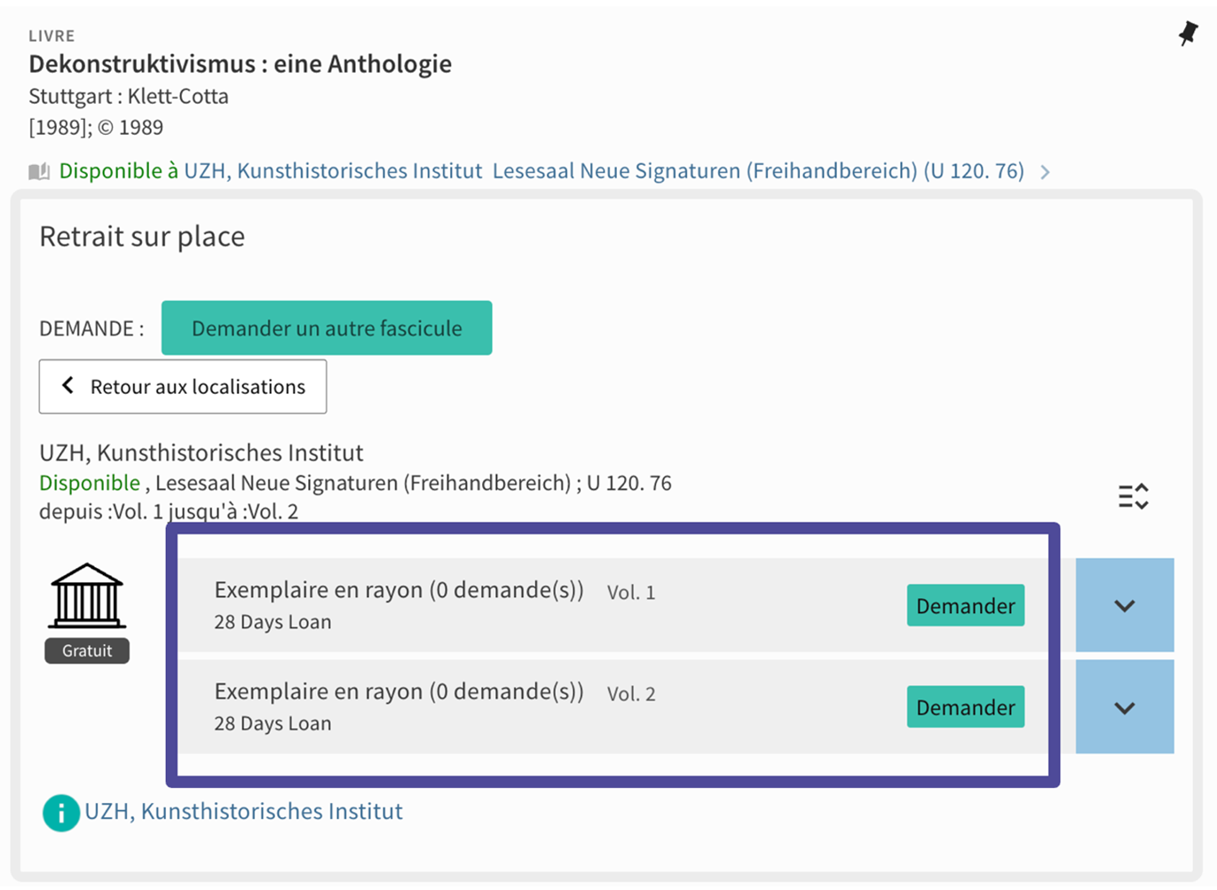 Les ouvrages en plusieurs volumes et les numéros de revues peuvent être demandés gratuitement dans la section « Retrait sur place » si vous voulez les retirer directement dans la bibliothèque où ils se trouvent.