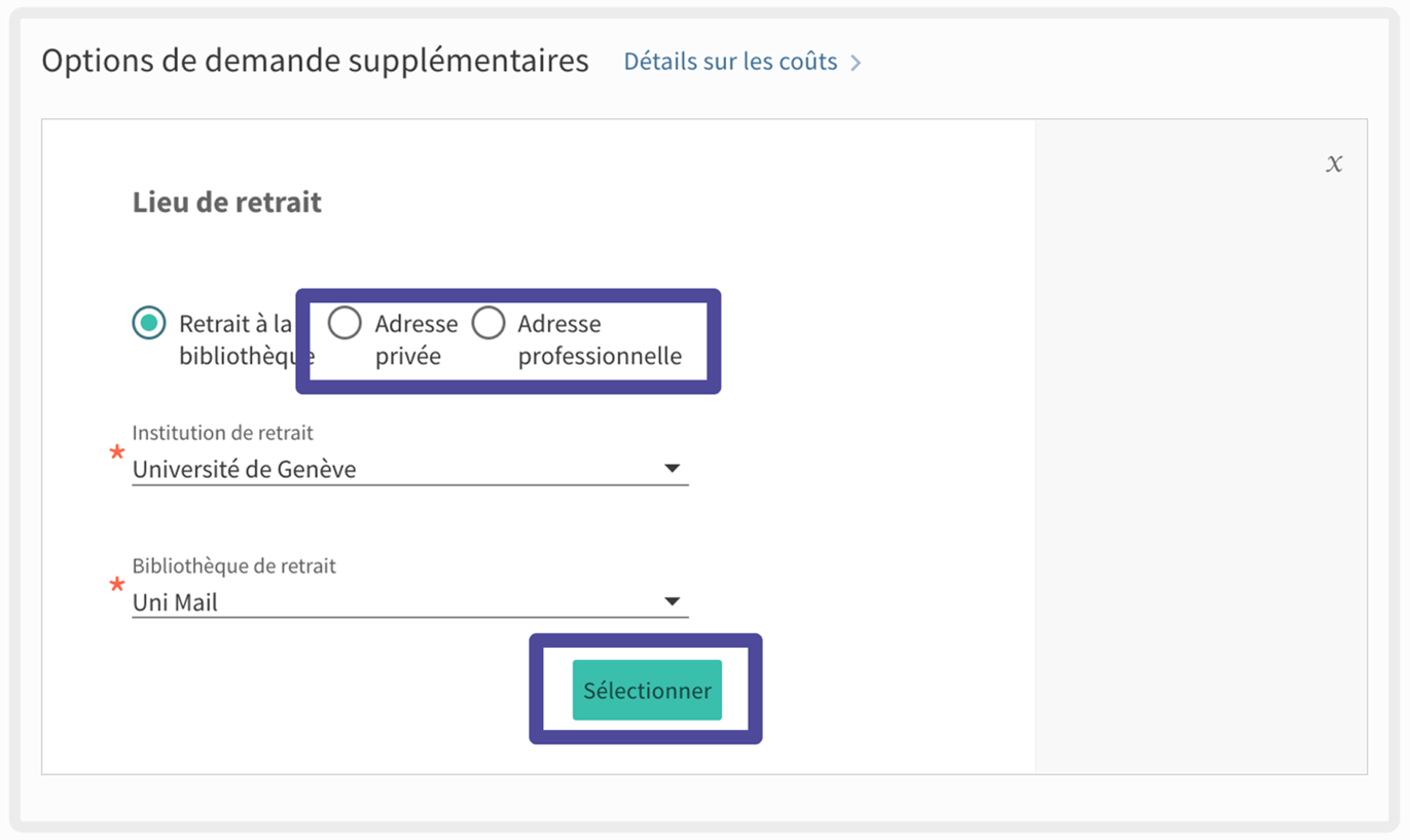 Vous pouvez y sélectionner votre institution de retrait et votre bibliothèque de retrait préférée pour les livraisons par navette ou vous pouvez sélectionner l’adresse de votre domicile ou de votre bureau pour les envois postaux: