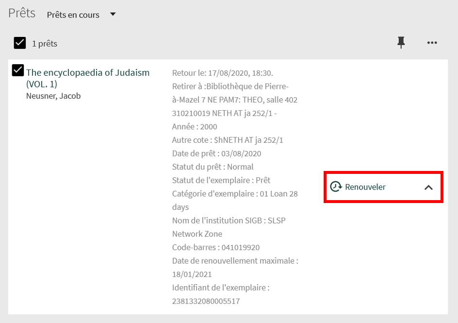 Dans Mon compte, vous pouvez voir vos prêts en cours et les renouveler tous ou individuellement sous réserve que les conditions du prêt le permettent.