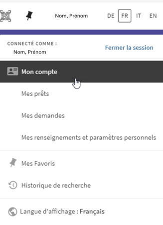 Pour accéder à votre compte, identifiez-vous dans swisscovery ou dans une interface locale et cliquez sur votre nom situé en haut à droite de la page.