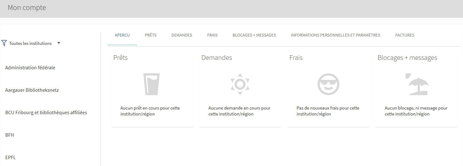 Chaque institution dispose de son propre espace. Cela signifie, par exemple, que toutes les demandes et actions effectuées à la BCU Fribourg sont visibles dans l’espace de la BCU Fribourg, tandis que celles effectuées à ETH Zürich sont visibles dans l’espace de ETH Zürich. Ces espaces sont accessibles dans swisscovery ainsi que dans toutes les interfaces locales. La navigation entre les espaces se fait via la colonne de gauche.