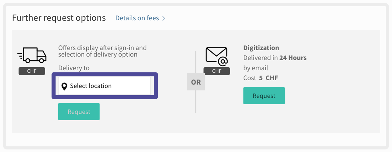 In the “Further Request Options” section it is possible to request resources via the national SLSP courier service for selected swisscovery and Renouvaud libraries.