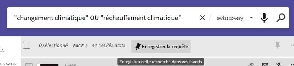 Si vous vous êtes identifié (e), vous pouvez enregistrer vos recherches de manière permanente. Pour cela, cliquez sur «Enregistrer la requête» situé au-dessus de la liste de résultats: