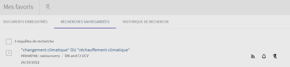 Vous pouvez lancer à nouveau la même recherche en cliquant sur les termes de la requête. Vous pouvez configurer une notification (par RSS ou par e-mail) en utilisant les symboles situés à droite pour vous tenir informé(e) des derniers documents ajoutés qui correspondent à vos critères de recherche.