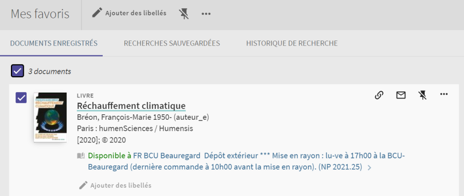 Vous pouvez retirer ou exporter des titres individuels depuis votre liste de favoris. Surlignez un ou plusieurs titres et utilisez les symboles situés en haut de la page pour les retirer, ajouter des libellés, les exporter vers des outils de gestion des références, les imprimer ou les envoyer par e-mail: