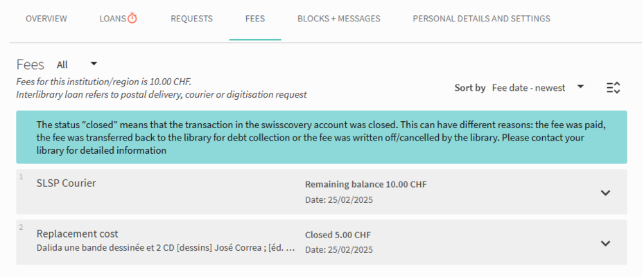 The status “closed” means that the transaction in the swisscovery account was closed because the fee was paid, the fee was transferred back to the library for debt collection or the fee was written off/cancelled by the library. Please contact your library for detailed information.