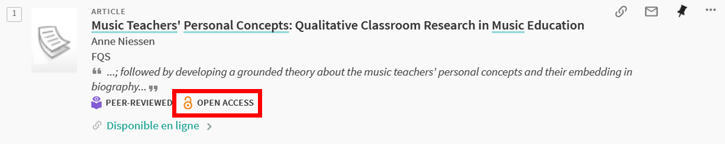 Les documents « Open Access » sont libres d'accès. Il s'agit d'une part d'articles de périodiques ou d'e-books disponibles sur différentes plateformes ou via des répertoires institutionnels, et d'autre part, de documents numérisés de et par les bibliothèques. Ces documents sont indiqués dans la liste de résultats avec une icône « open access ».