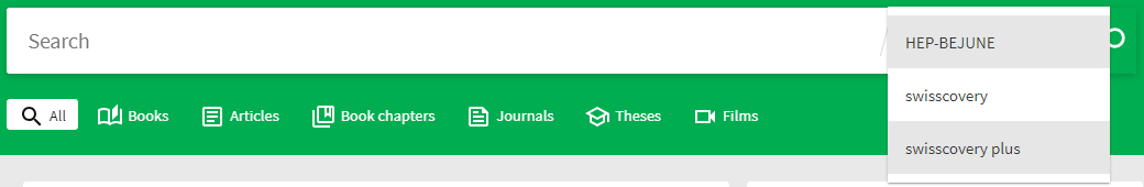 The resources offered by the libraries are searchable via three standard search profiles: swisscovery, swisscovery plus and, only in the local interfaces, “My Library”. In certain local interfaces it is possible to find additional custom search profiles.