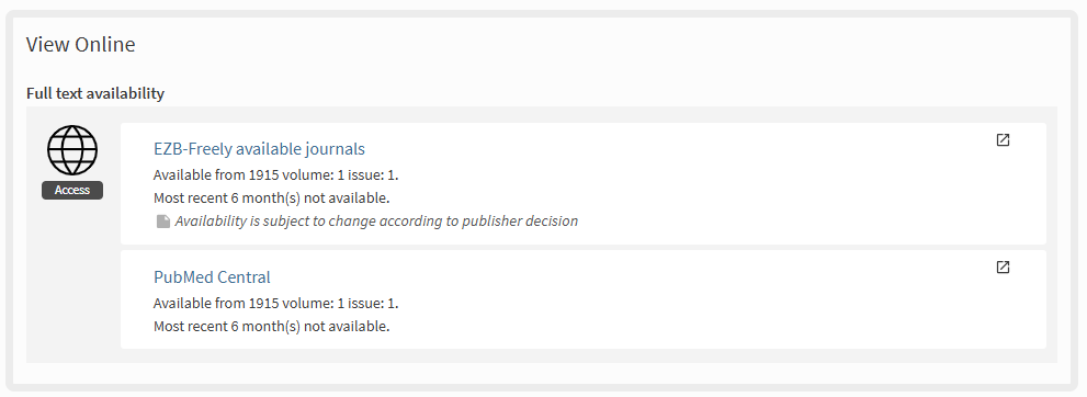 The «View Online» section give access to the full text of an e-resource, it is enough to click on the boxes to open the page that contain the resource.