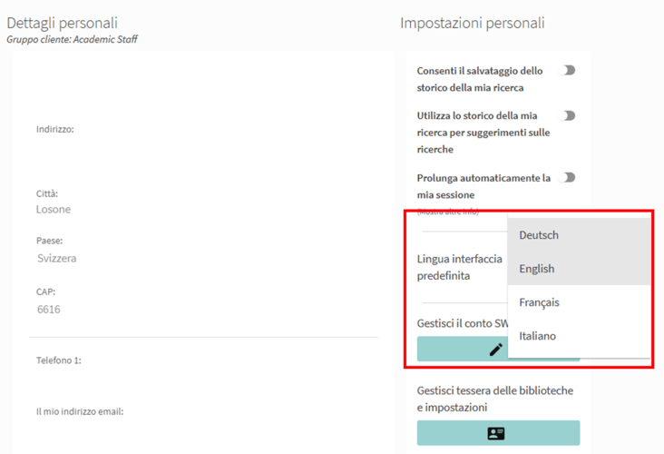 Per modificare in modo permanente l’impostazione della lingua di swisscovery, effettuare il login e selezionare il vostro account nell’angolo in alto a destra della pagina. In “Il mio conto” – “Dettagli e impostazioni personali”, cambiare la lingua nel riquadro “Lingua interfaccia predefinita”.