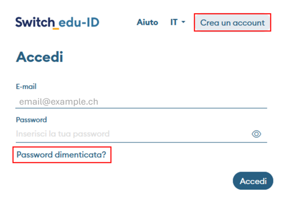 Dopo aver avviato la registrazione verrà chiesto di eseguire il login ad un account Switch edu-ID. Se si è già in possesso di un conto Switch edu-ID, è sufficiente utilizzare queste credenziali per procedere con la registrazione. Se non si possiede ancora una password, sulla pagina di login è disponibile il link “Password dimenticata” per reimpostare la password.