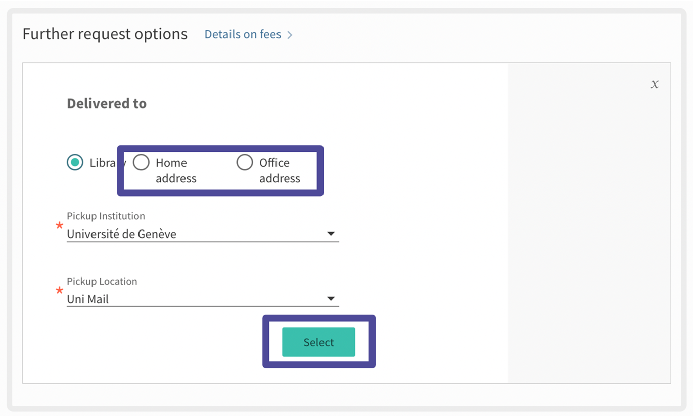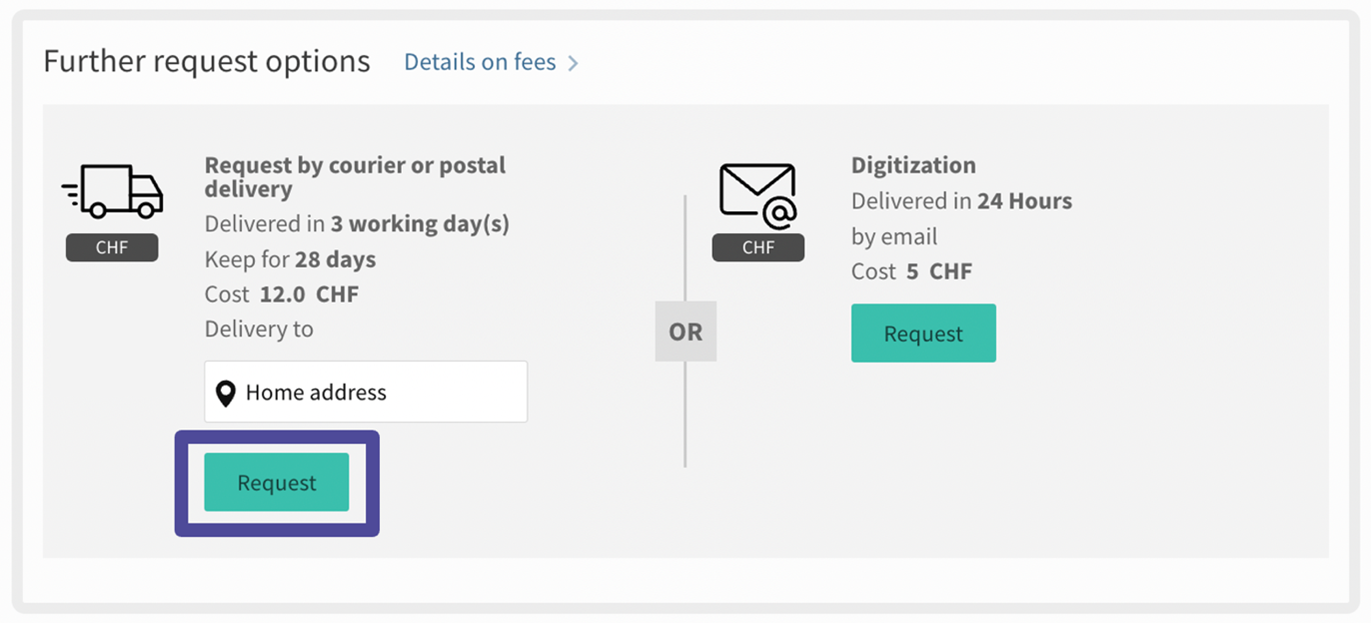 Please note that your home and/or work address only display in swisscovery, if these addresses are registered in your Switch Edu-ID account. Please also note that the delivery time displayed is based on an estimation. Occasional library closings, during holidays for instance, may affect delivery times.