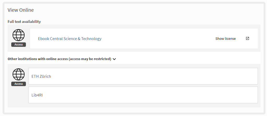 After clicking on the record of online resource, the "View Online" section provides information about the availability of the resource in your institution and in other institutions. You can access only resources from your institution. To access the resource, click on the icon