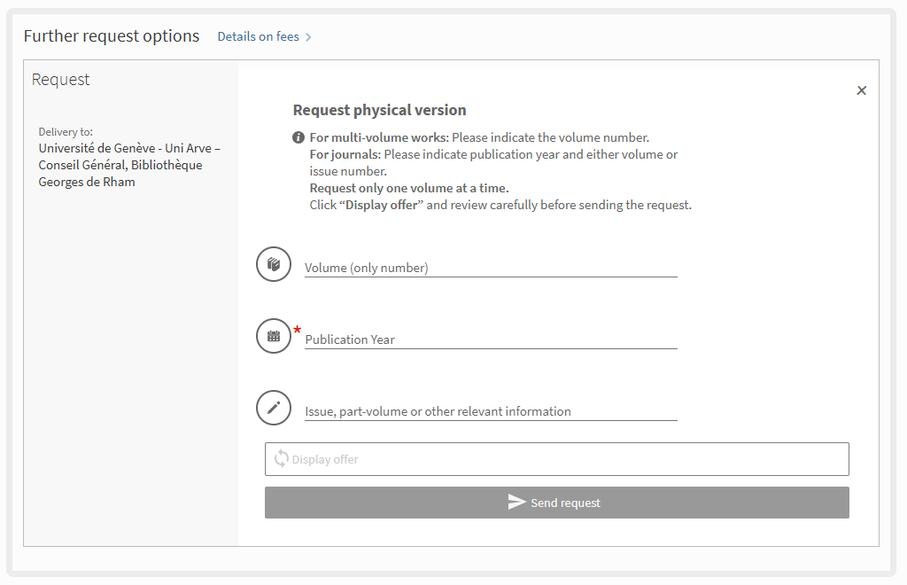 When requesting a multi-volume work in the “Further Request Options” section, please always indicate which volume and/or issue you would like to request in the request form and click on “Display offer” before sending the request.