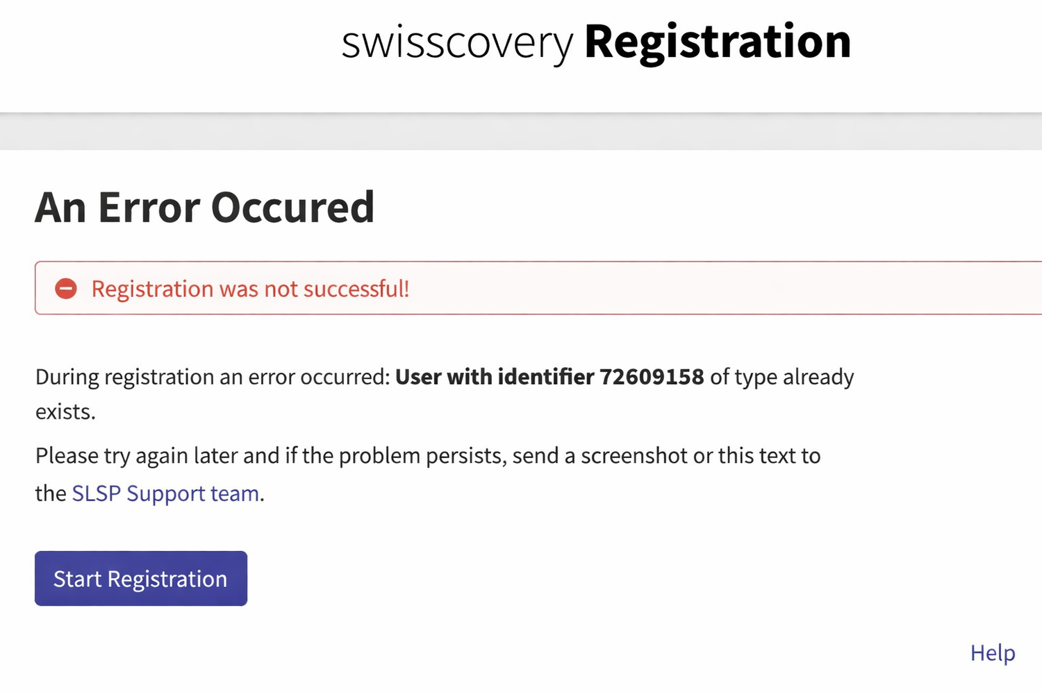 The error User with identifier (matriculation number) of type already exists appears because an account linked to the matriculation number shown in the message already exists in SWITCH edu-ID/swisscovery.